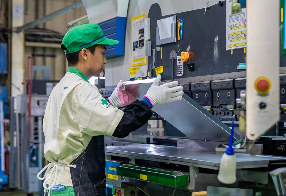 住宅やビル向けの空調部品を、一枚の材料から加工してつくっています。
